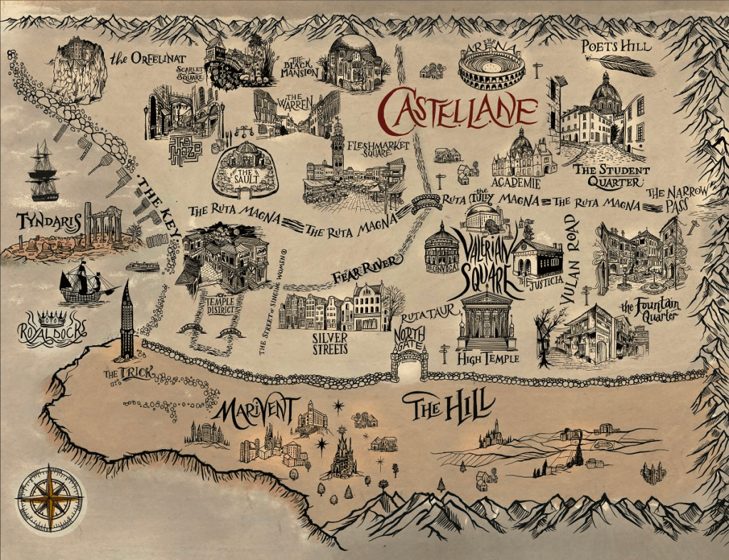 I know, it sounds like a lot. It IS a lot. As can be expected from the first book in a series, there is a lot of world building and character introductions. The good thing about Clare’s writing, is she shows you the world and allows you to build it yourself through the colours, the smells, the food and costumes. The architecture and city scape are almost a character in their own right. I didn’t have this graphic when I was reading but it’s very helpful: